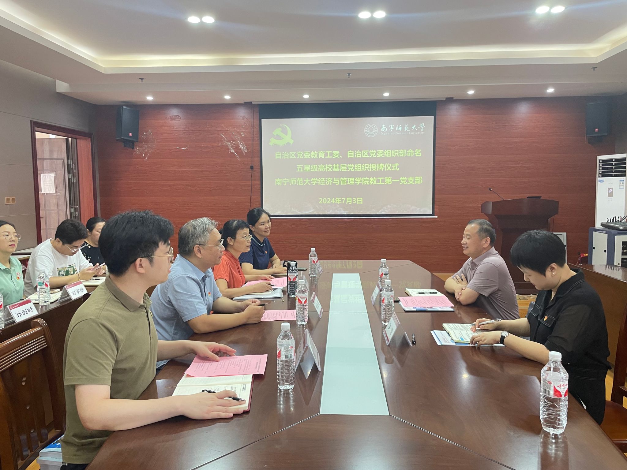7月3日,学校“自治区党委教育工委、自治区党委组织部命名五星级高校基层党组织”授牌仪式在经济与管理学院举行,党委组织部副部长、乡村振兴工作办公室副主任吴少进出席授牌仪式并向经济与管理学院教工第一党支部授牌。授牌仪式由经济与管理学院党委书记韦海鸣主持,经济与管理学院党委委员、党支部书记、党员教师代表参加仪式。